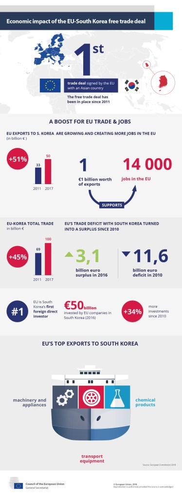 Le 1er juillet 2011, est entré en vigueur l’accord de libre-échange entre la Corée du Sud et l’Union européenne, faisant de la Corée du Sud le premier pays asiatique à mettre en œuvre un ALE avec l’UE. Et par rapport à ses rivaux de la région dont le Japon, Séoul a eu le nez creux en s’intéressant au marché européen ces dix dernières années. Car selon un rapport de l’Institut pour le commerce international de la Kotra, l’Agence coréenne pour la promotion du commerce extérieur et des investissements, cet accord commercial a bien profité à la Corée du Sud dans le secteur des exportations d’automobiles, des batteries et des produits chimiques.
